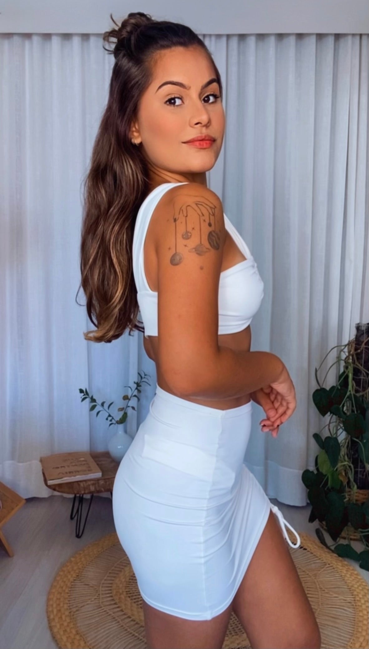 Saia curta, se ajusta perfeitamente ao corpo, sem elástico na cintura garantindo o máximo de conforto e modelagem que afina a silhueta. Possui canaleta na lateral onde é possível ajustar o comprimento como desejar.